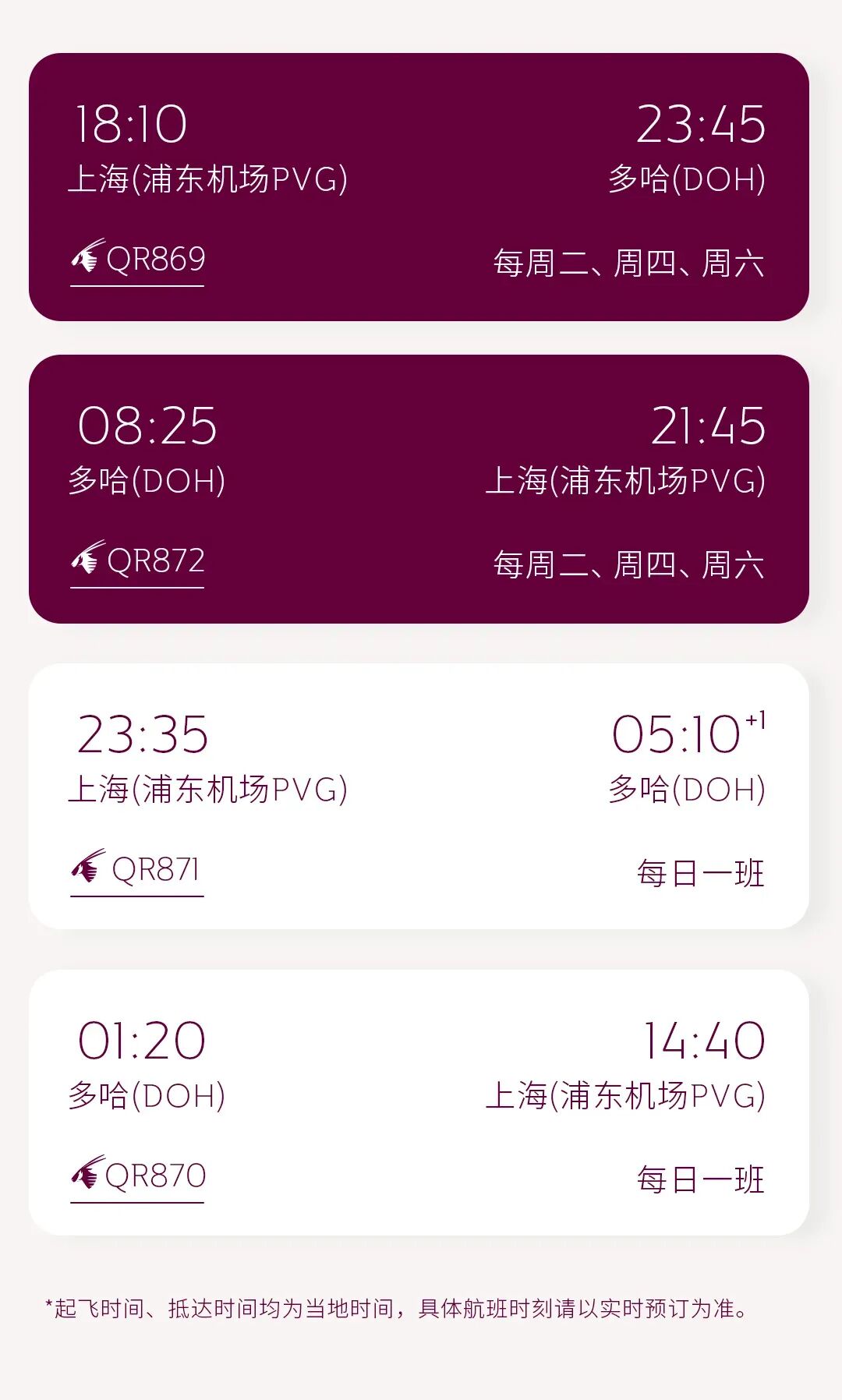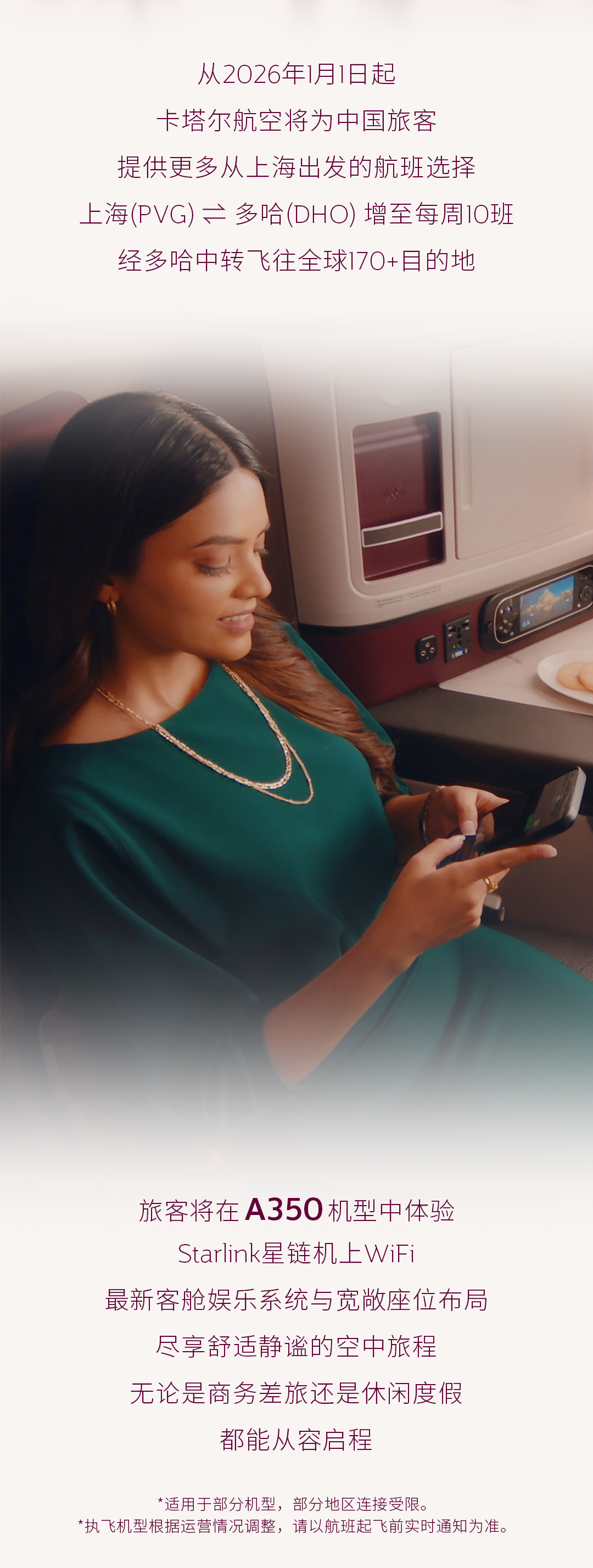 2026年1月1日起(含)卡塔尔航空新增上海=多哈直飞客运航班